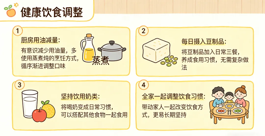 所以更实际的方法,是把它变成整个家庭的小调整。比如这周开始,家里少做一两次油炸,多加两三次豆制品,固定备一点奶。看起来都是小事,但正是这些小改变,最容易慢慢影响一家人的饮食方向。