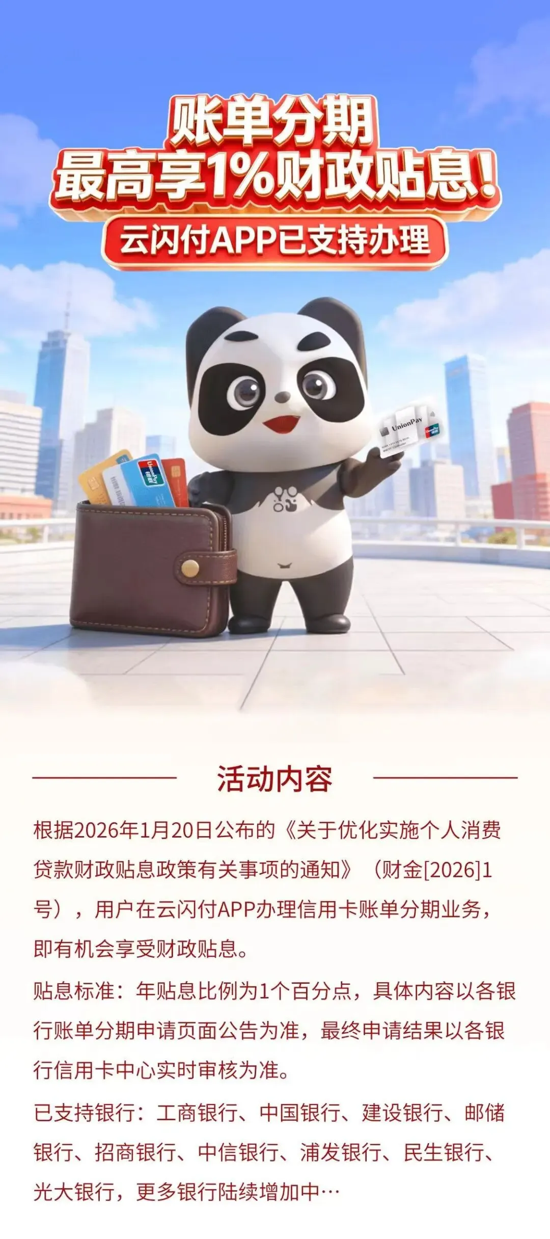 本文最后更新于2026-03-10,某些文章具有时效性,若有错误或已失效,请在下方留言或联系老夜。 【U福啦】划重点!云闪付APP办理账单分期可享财政贴息!9家银行已支持! 本文转自“中国银联95516”微信公众号 点击此处“阅读全文”查看更多内容 本地福利 本地福兵团农行信用卡享10元洗车权益利 | 她说:买车的理由竟然是…8888元现金大奖
