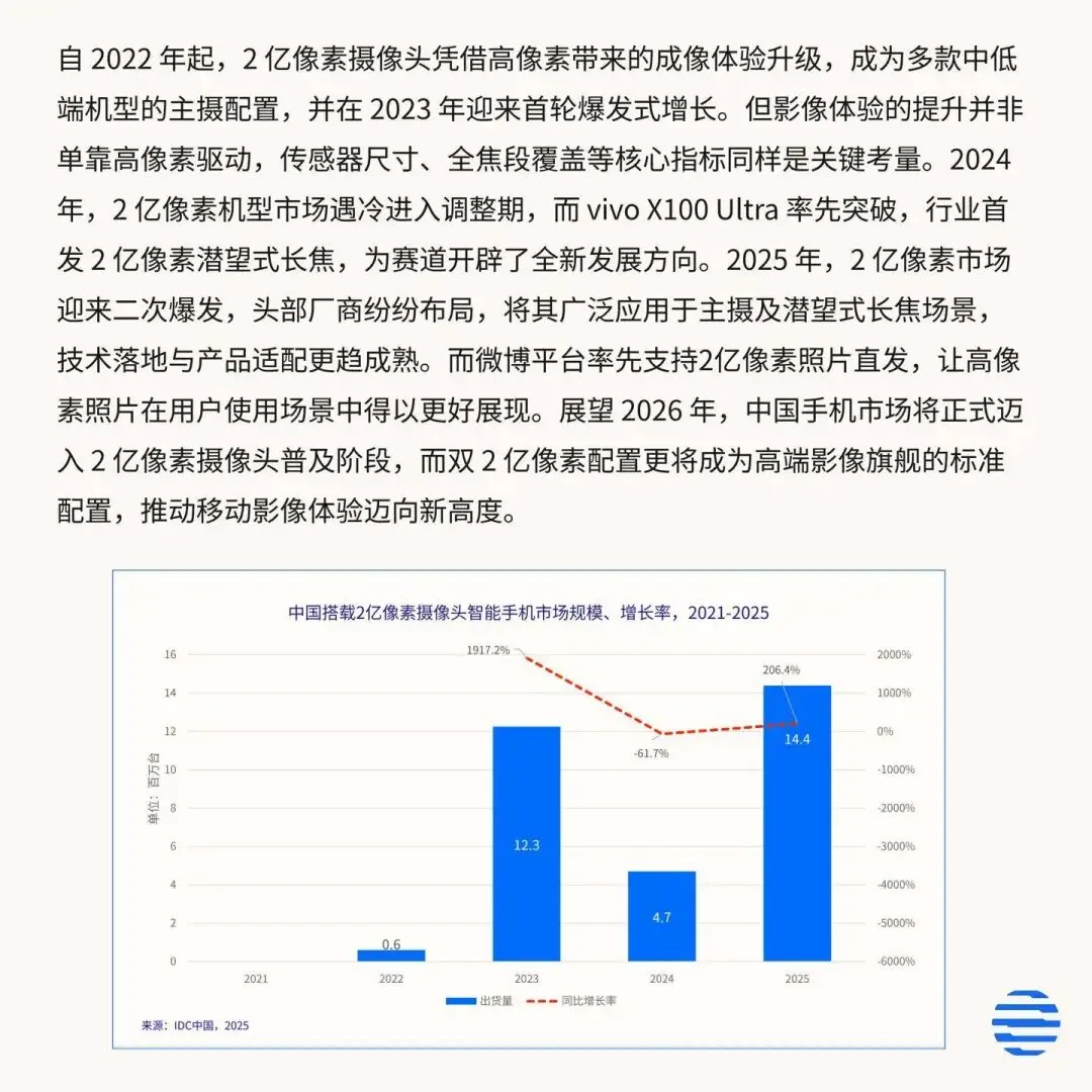 IT之家 3 月 6 日消息,今天午间,IDC 咨询发布报告称,2 亿像素摄像头自 2022 年起在中低端机型普及并于 2023 年首轮爆发,2024 年遇冷后因 vivo 技术突破迎来新方向,2025 年实现二次爆发且伴随社交平台适配落地。