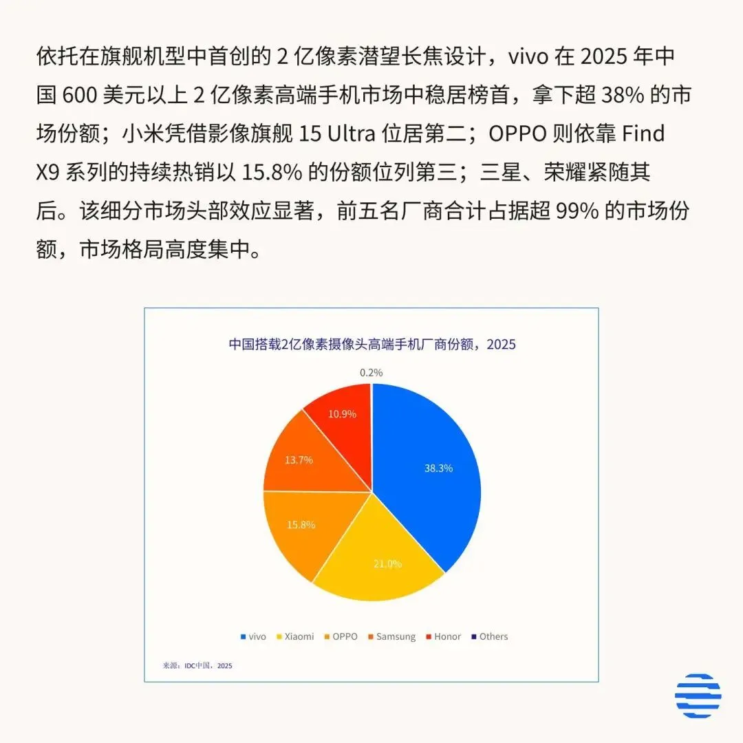 依托在旗舰机型中首创的 2 亿像素潜望长焦设计,vivo 在 2025 年中国 600 美元(IT之家注:现汇率约合 4146 元人民币)以上 2 亿像素高端手机市场中稳居榜首,拿下超 38% 的市场份额;小米凭借影像旗舰 15 Ultra 位居第二;OPPO 则依靠 FindX9 系列的持续热销以 15.8% 的份额位列第三;三星、荣耀紧随其后。该细分市场头部效应显著,前五名厂商合计占据超 99% 的市场份额,市场格局高度集中