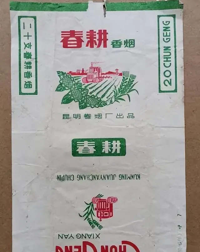 白底绿字,拖拉机翻着地,植物绕着一圈,春耕香烟是计划经济年代的代表,家里分烟票的时候二叔总说,抽春耕够实在,不挑嘴,往农田一坐能抽上一根,自己偷着美,用春耕点鞭炮那脆响,跟直接火柴点不一样,小时候特喜欢闻那个点燃冒的烟丝味儿。
