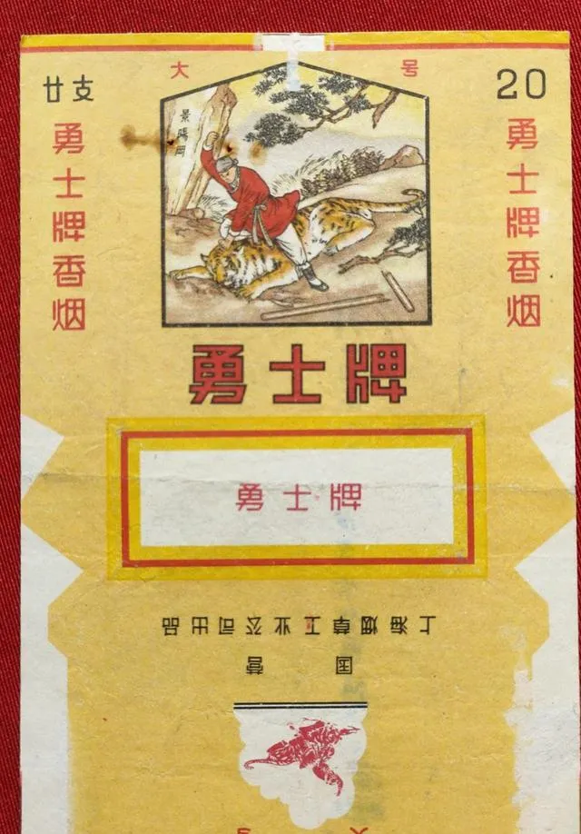黄底红字,上头画着戴大帽子的壮汉正和老虎搏斗,这牌子造型直接,小孩看着觉得凶狠,小时候烟贩子门口散根卖的有这款,老头说这烟劲大,别瞎学,抽得多咳嗽,看着烟盒就想起来那会儿打弹珠用空壳的时光。