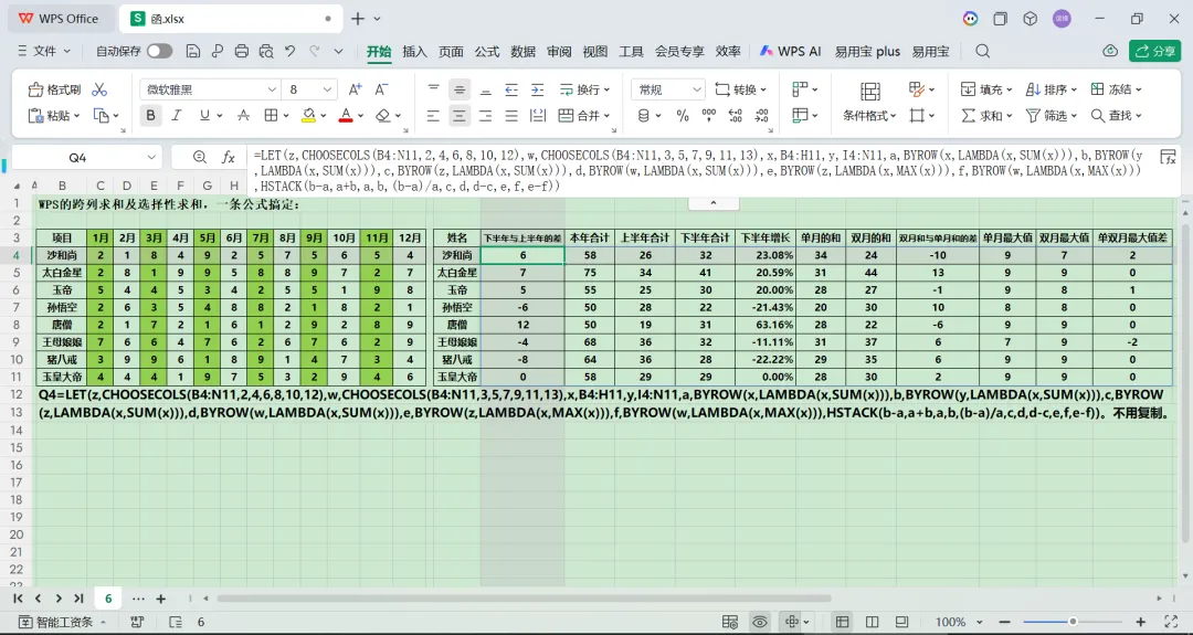 本文最后更新于2026-03-10,某些文章具有时效性,若有错误或已失效,请在下方留言或联系老夜。 WPS 软件的跨列求和与选择性求和功能,仅需一条公式即可实现 WPS 软件的跨列求和与选择性求和功能,仅需一条公式即可实现。以下请参阅图表进行详细讲解: