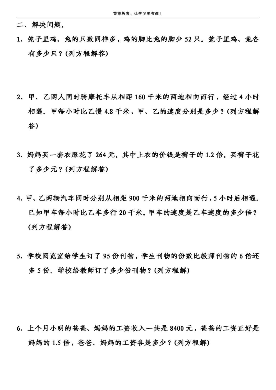 五年级下册数学解方程应用题,可打印附答案!