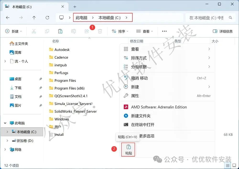 5、打开本地C盘,再右键点击【粘贴按钮】