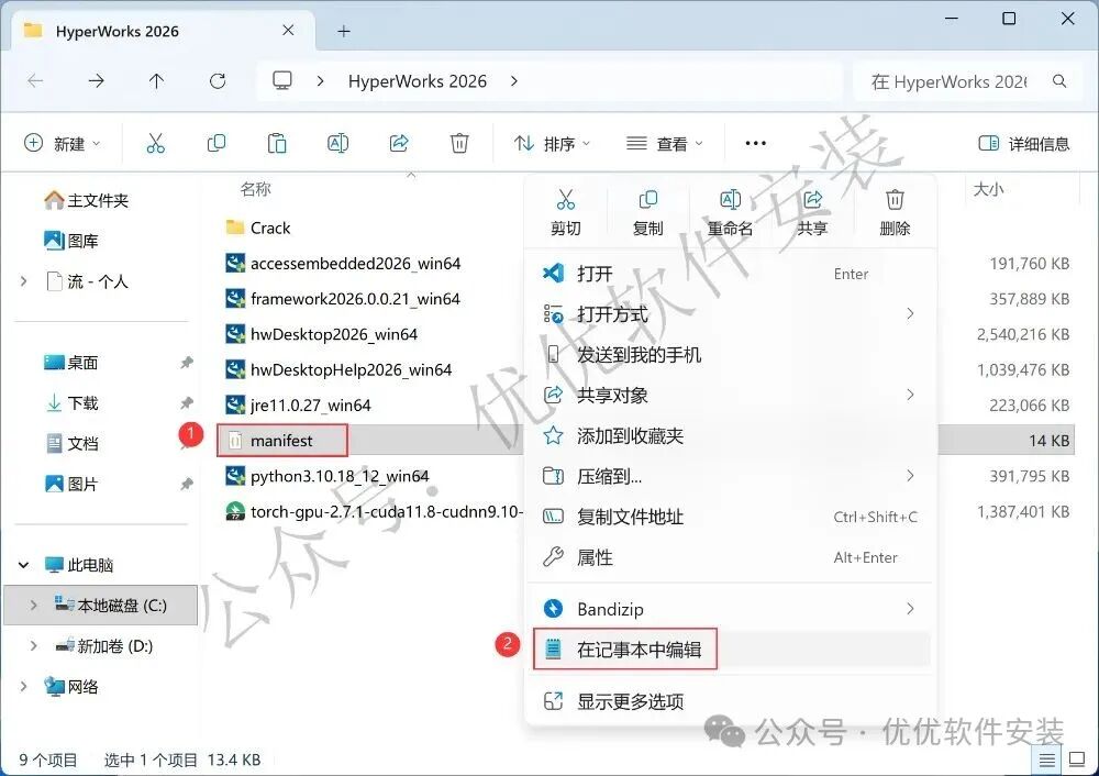 18、回到HyperWorks 2026文件夹,找到【manifest】文件,右键点击【在记事本中编辑】