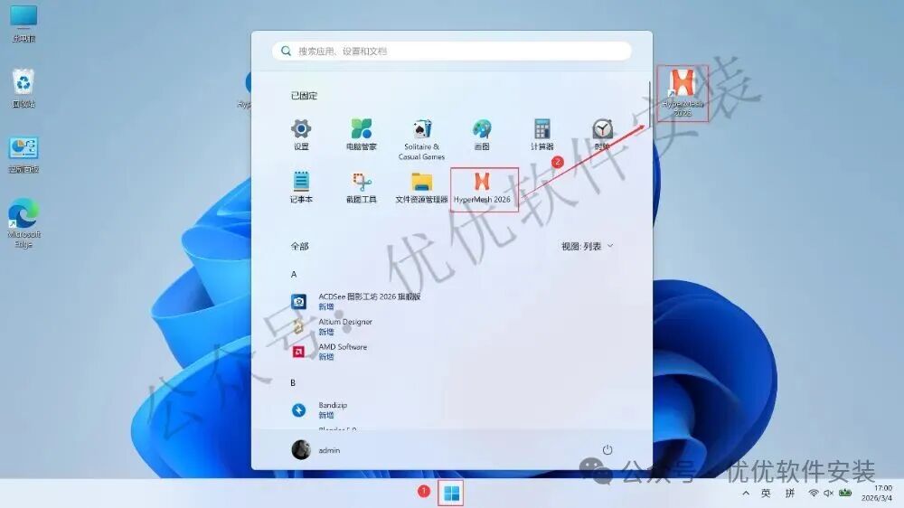 30、回到桌面,点击任务栏的【开始菜单】,在【所有应用】中找到【HyperMesh 2026软件图标】,将软件图标拖到桌面上,完成软件桌面快捷方式的创建