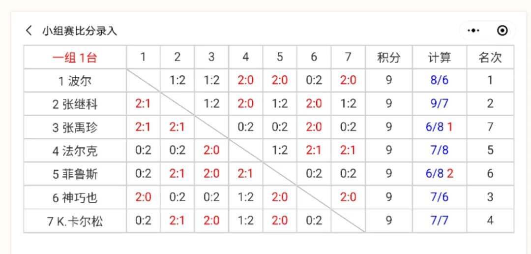 2、小组赛比赛成绩及时录入。打一盘比赛就录一盘比分;小组赛比分录入完成,自动生成名次。