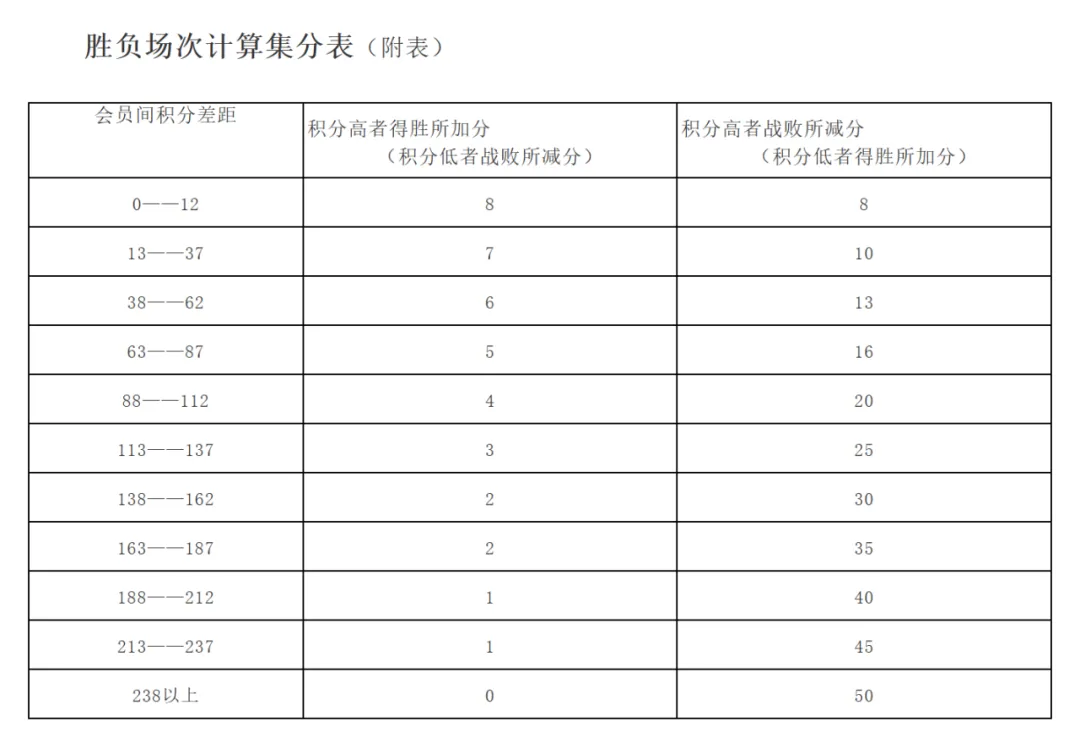2、每一场比赛结果均应依照以下积分表计算成绩(如下表),积分表左栏是积分差额范围,中栏是积分高者得胜之加分(即:积分低者落败之减分),右栏是积分高者落败之减分(即:积分低者得胜之加分)。