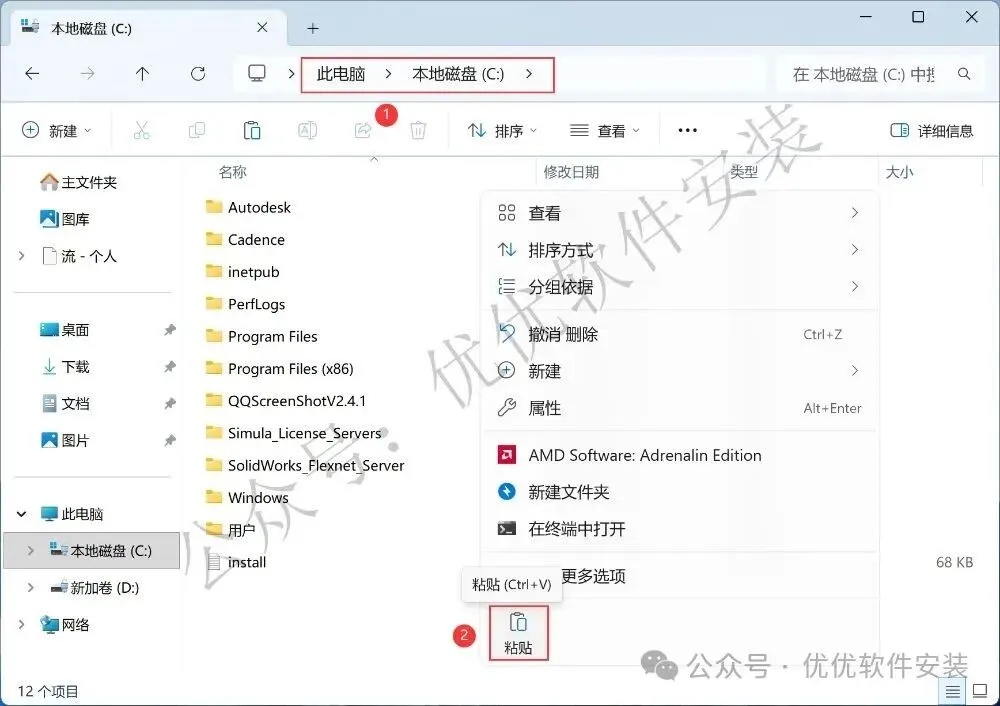 8、打开本地C盘,再右键文件夹的空白处,点击【粘贴按钮】