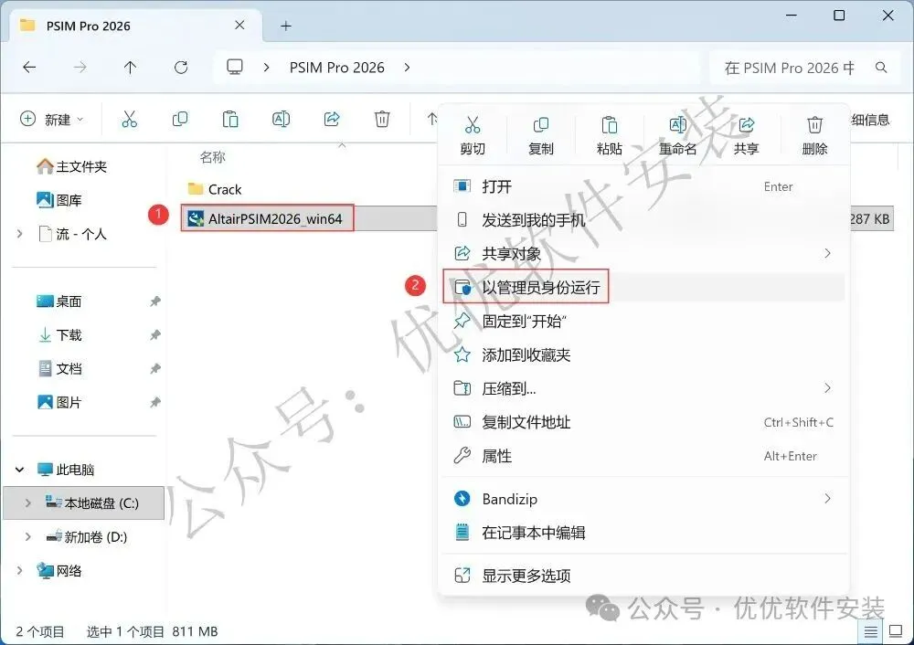 9、回到PSIM Pro 2026文件夹,找到【AltairPSIM2026_win64】应用程序,右键选择【以管理员身份运行】它