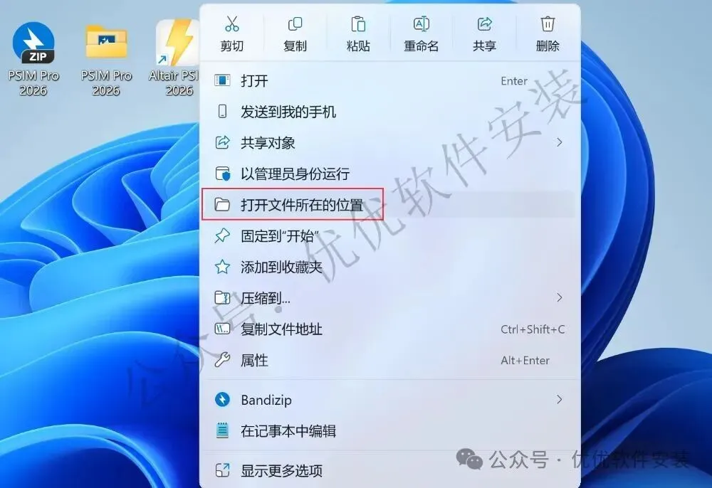 20、回到桌面,右键桌面上的【PSIM 2026软件图标】,点击【打开文件所在的位置】