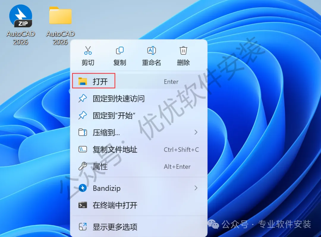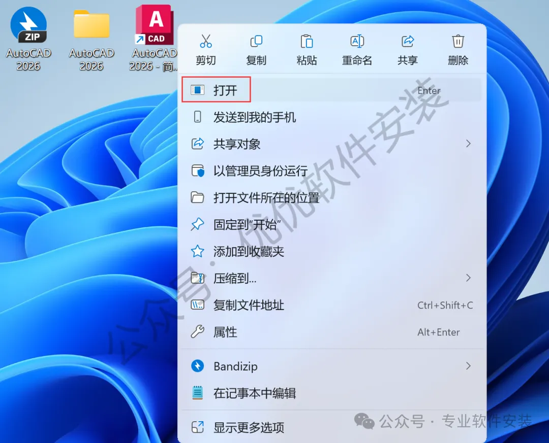 14、回到桌面,右键桌面上的【AutoCAD 2026软件图标】,点击【打开】