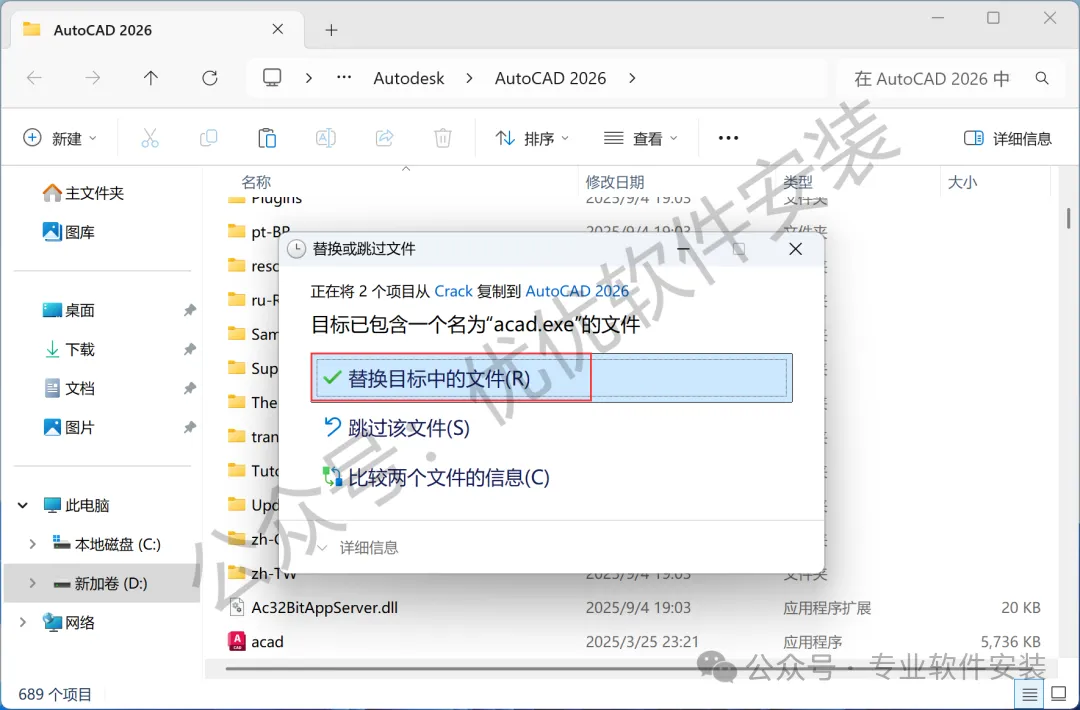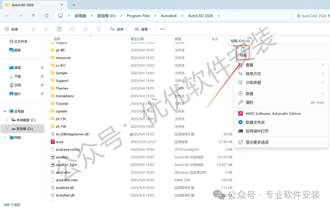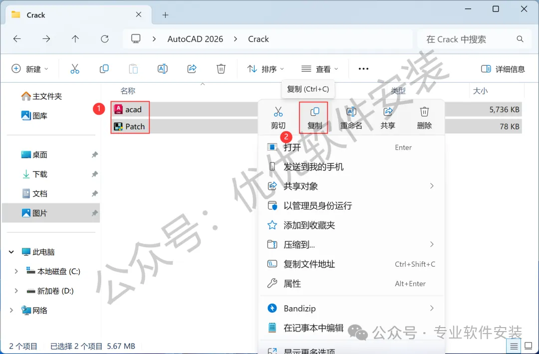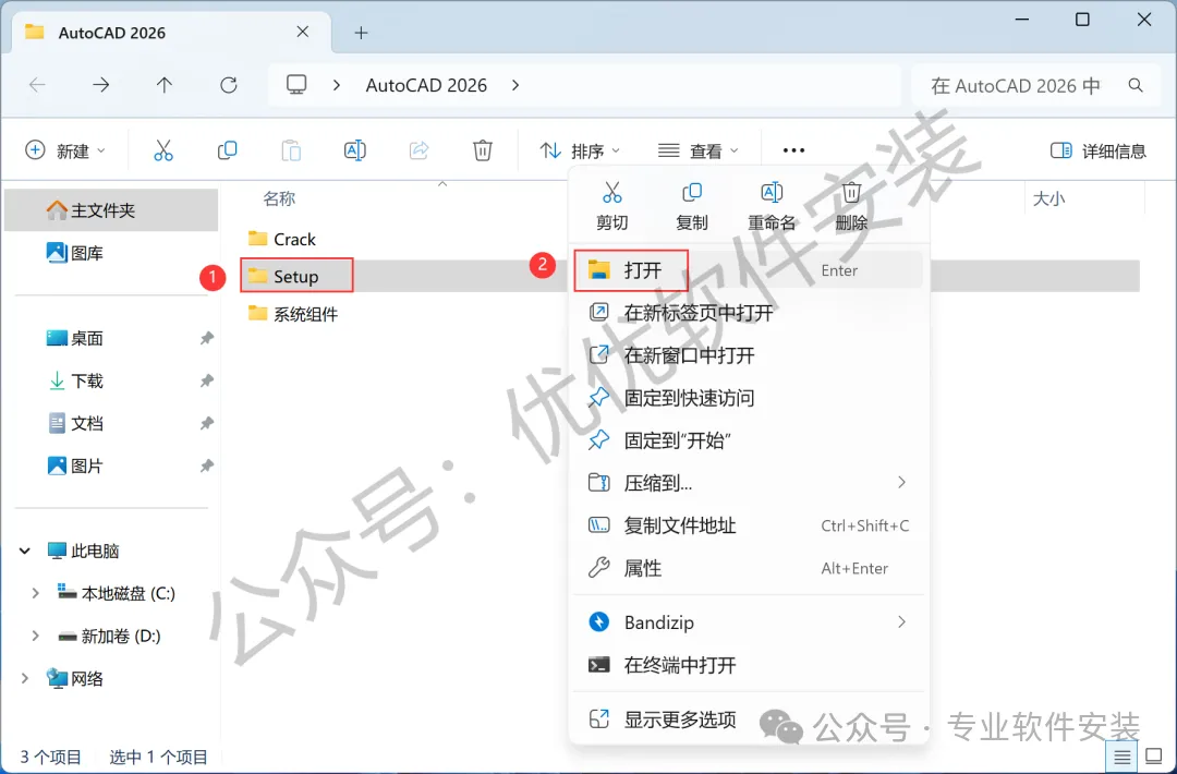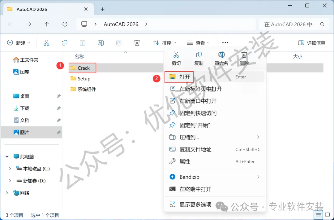 9、回到AutoCAD 2026文件夹,找到【Crack】文件夹,右键【打开】它