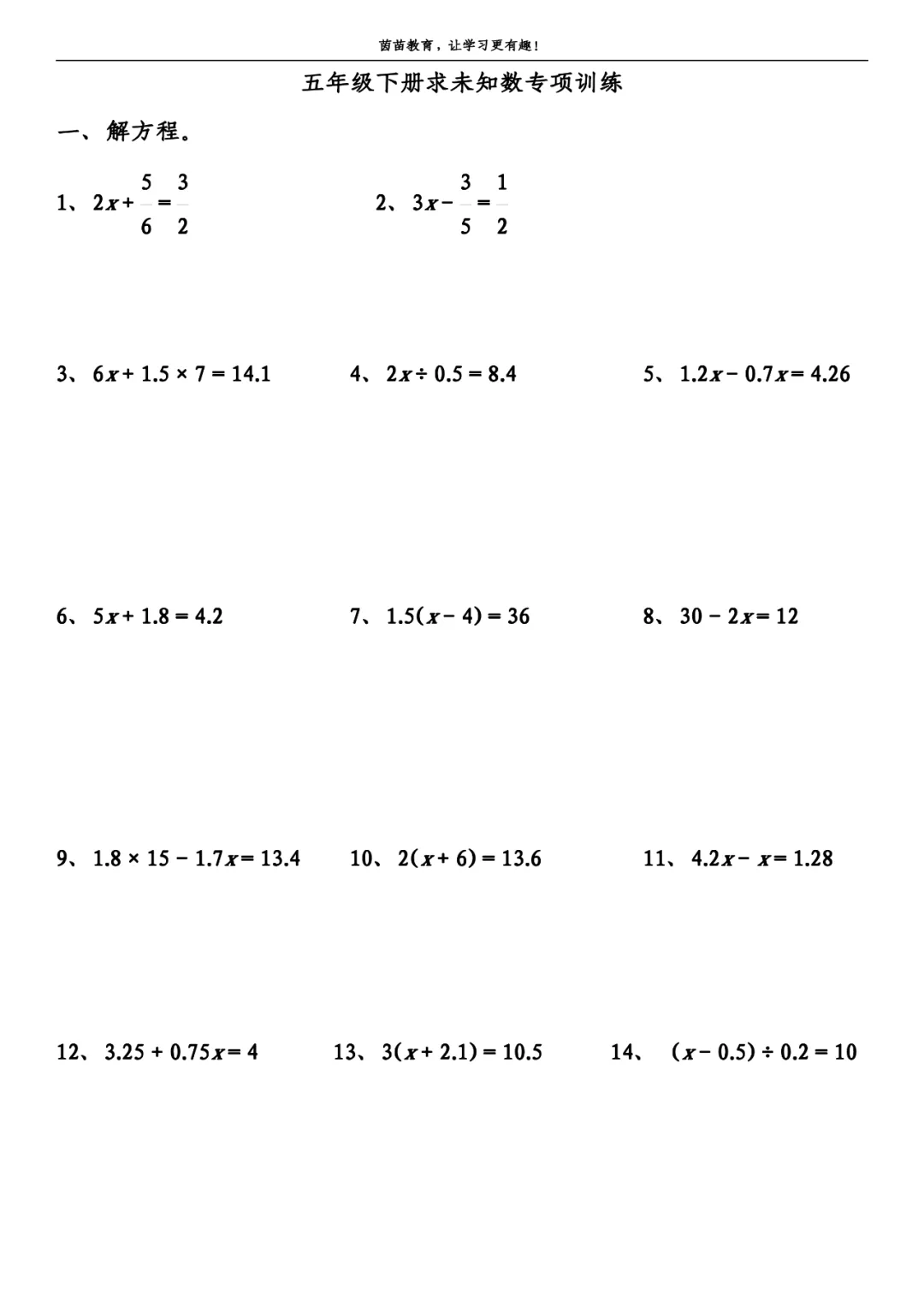 五年级下册数学解方程应用题,可打印附答案!