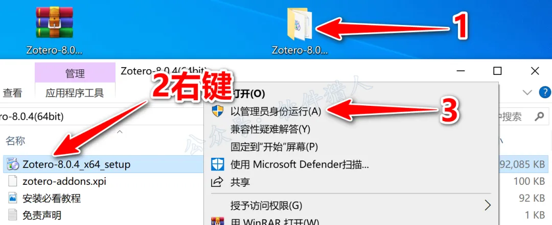 2.打开解压后的【Zotero-8.0】文件夹,鼠标右击【Zotero-8.0_x64_setup】选择【以管理员身份运行】。