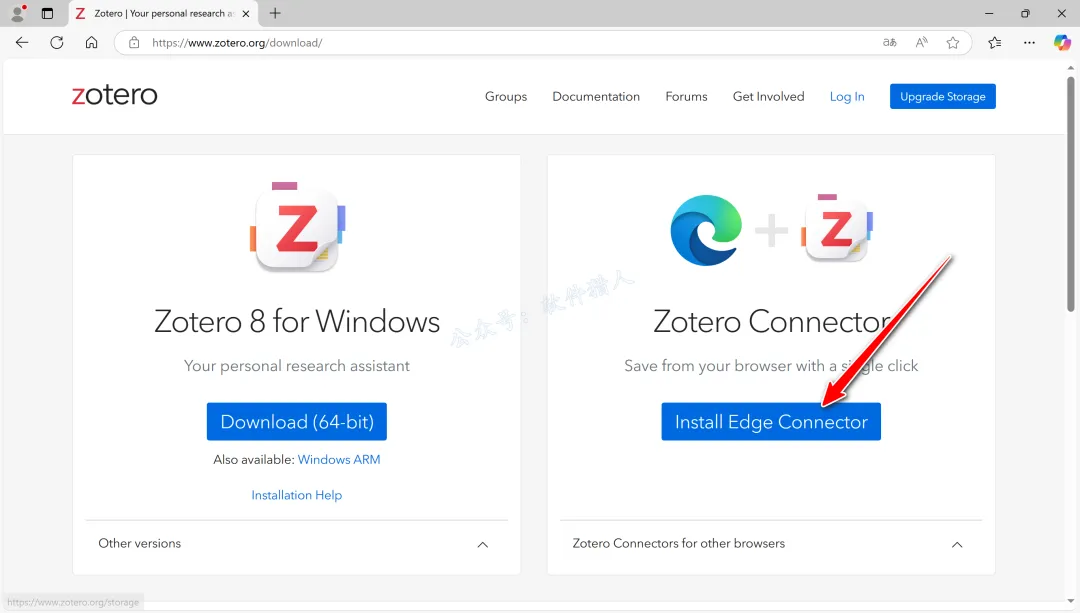 10.软件打开后会自动弹出网页,提示我们安装浏览器插件,以便于在浏览器里直接将文献信息提取到软件,若没有弹出就打开Microsoft Edge浏览器自行到官网https://www.zotero.org/download安装。(注意:如果默认浏览器是谷歌浏览器,点击下载插件是没反应的,需要威屁嗯才能顺利下载,有能力的可自行尝试)。