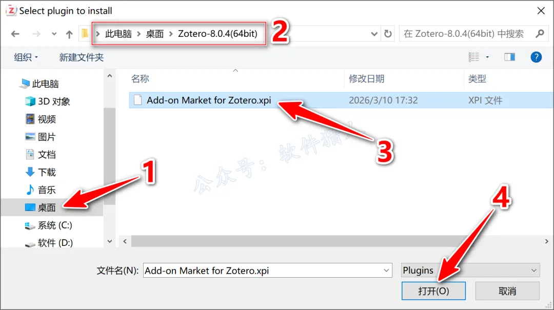 16.选择安装包解压后的文件夹位置,选中【Add-on Market for Zotero】,点击【打开】文件。