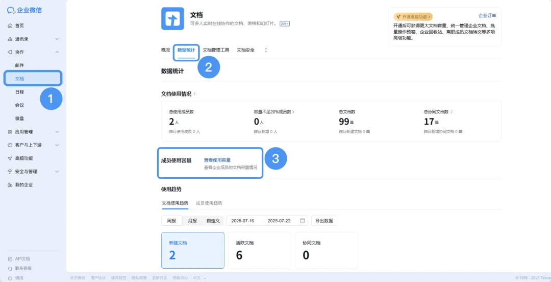 企业超级管理员可进入【管理后台 -> 协作 -> 文档 -> 数据统计 -> 查看使用容量】,查看企业成员的文档容量情况。