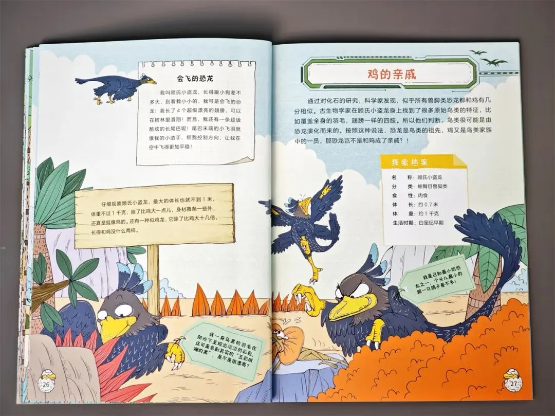 有一种会飞的恐龙,长得很像鸡,名字是“顾氏小盗龙”,跟狗狗差不多大。