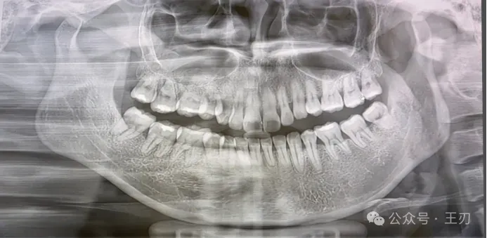 这是患者的X线全景片,是她三个月前洗牙的时候医生帮她拍的,该医生从这张全景片判断她没有牙周炎,尽管她要求了探诊,但医生拒绝探诊,并告知她“应该没有牙周炎”。