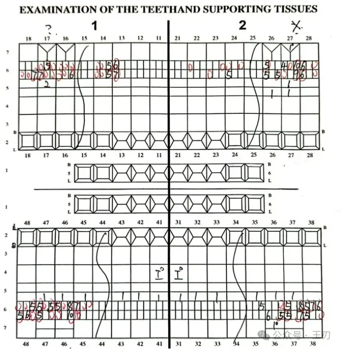 在了解她的病史之后,我花了10分钟给她做了详细的牙周探诊检查,以下是一些牙的探诊深度:她的磨牙邻面都有很深的牙周袋,特别是17,27,37和46。