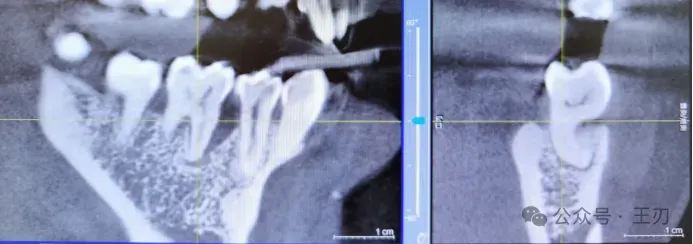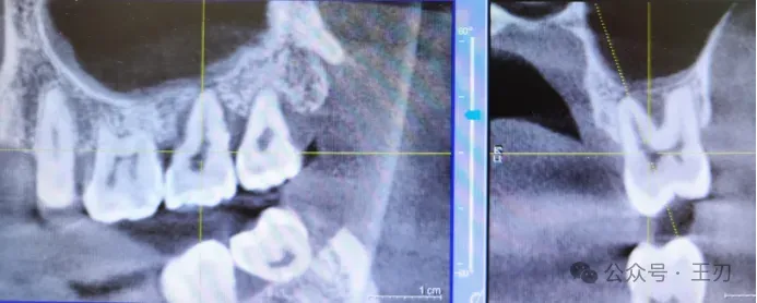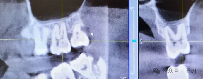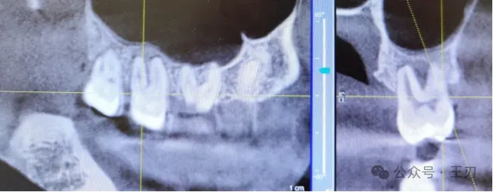 同样的,17的远中根据探诊结果有牙周深袋,将视图拉到舌侧(上图),可以看到17远中有明显的骨吸收,而将视图拉到颊侧(下图),看不到明显骨吸收。