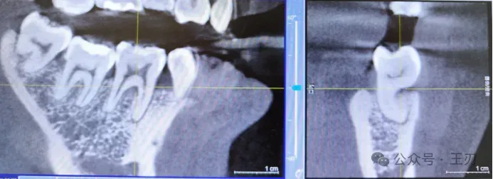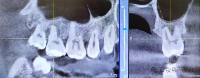 因为患者三个月前的全景片和咬合翼片都没能看出明显的骨吸收,根据探诊的结果我给她拍了CBCT: