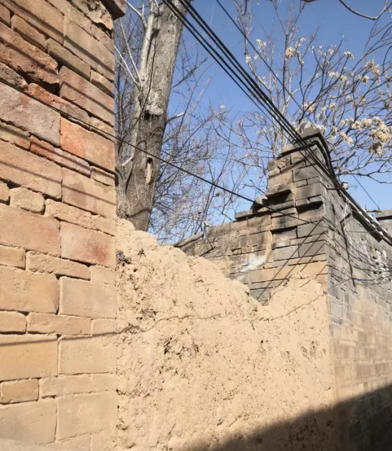 图里的断墙是老院的夯土墙,土里夹着碎砖瓦渣,冬天干裂出一道一道细缝,夏天下过雨手指一抠就掉渣,墙根儿牵着一串黑电线,像几条绳子勒着墙头不让它再塌下去,小时候躲猫猫就顺着这道墙跑,谁摔一跤,裤腿上印的都是黄土色,爷爷说这墙保暖,冬天不透风,后来新房子一盖,水泥刷上去,走在巷口就找不见这股土味了。