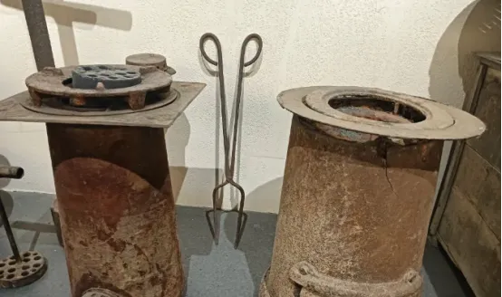 这几样铁家伙都绕不开一个主角,图中圆孔黑疙瘩叫蜂窝煤,细铁丝弯成的那只叫煤夹子,另一只大一点的叫炉钳,冬天一到,北方家家都有一口蜂窝煤炉子,早晨我爸一拉炉门,先用煤夹子拎一个煤球轻轻搁进火膛,再把前一天半截烧剩的对上口,打着纸一引,火苗顺着孔往上蹿,咝咝地响,屋里玻璃蒙上白雾,手心摊过去就暖了,奶奶总叮嘱一嘴,夜里记得开缝窗,煤球燃得不敞亮人容易犯困,现在暖气片一拧就热,炉钳和煤夹子也就挂在墙上当摆设了。
