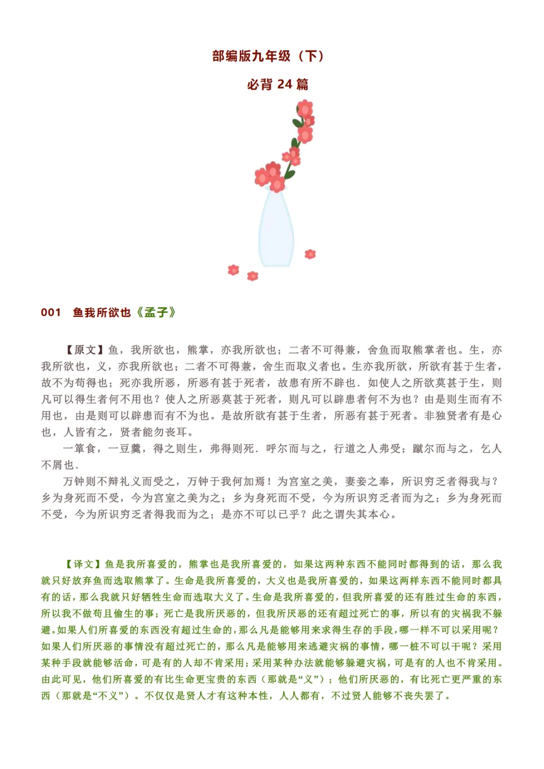 【免费下载】九年级(下)语文 必背24篇古诗文+译文,PDF电子版,可打印