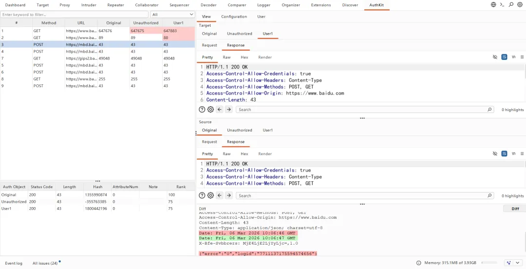 多身份自动重放:自动生成 Original、Unauthorized、UserA/UserB/...对比结果 -