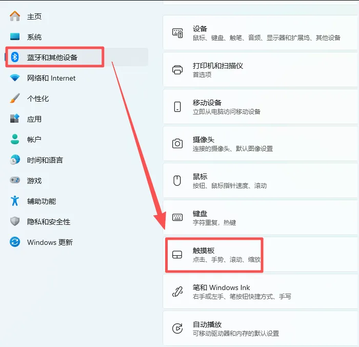 点击「蓝牙和其他设备」,再点击右边的「触摸板」选项