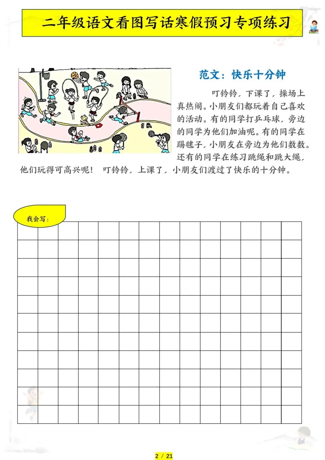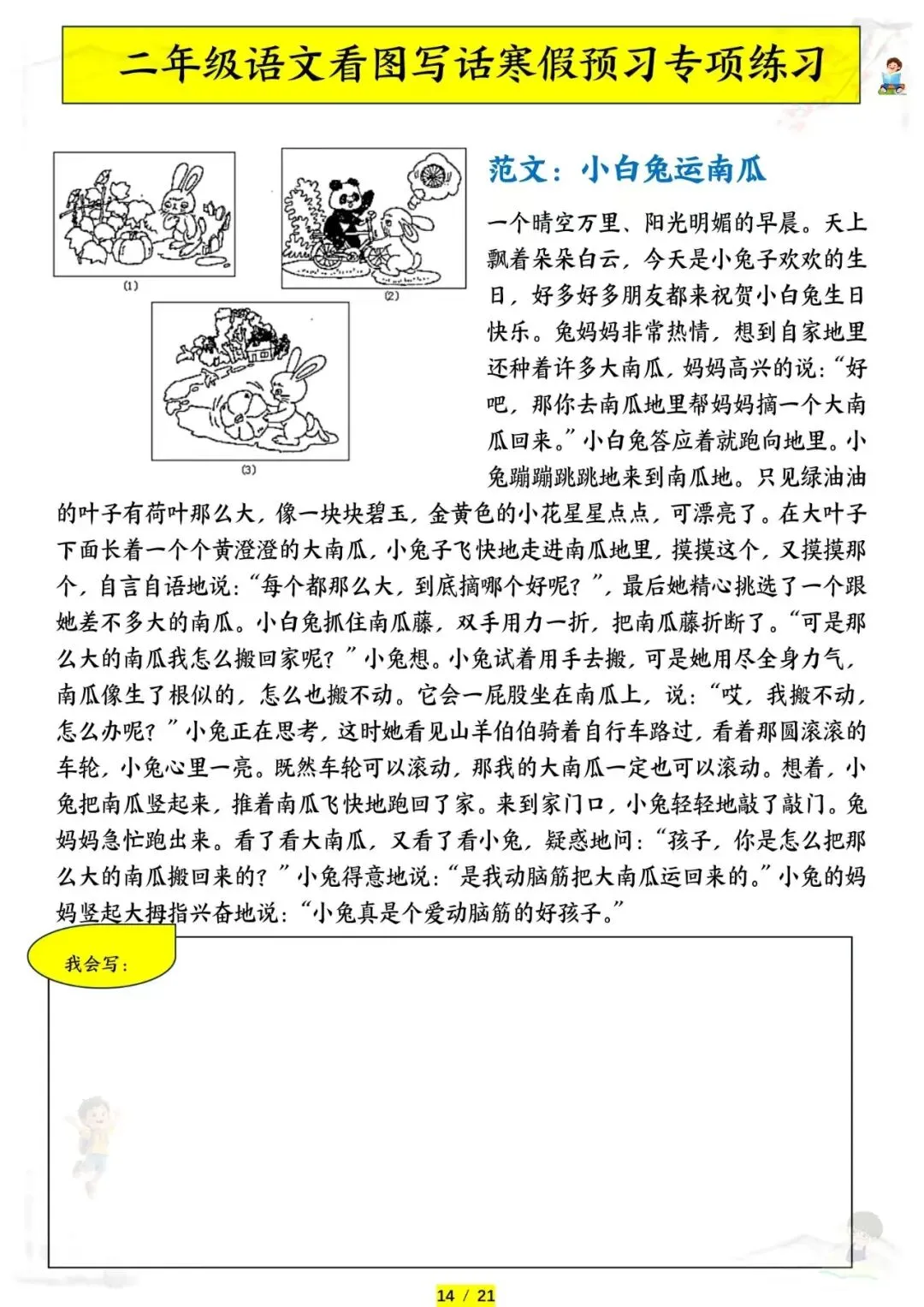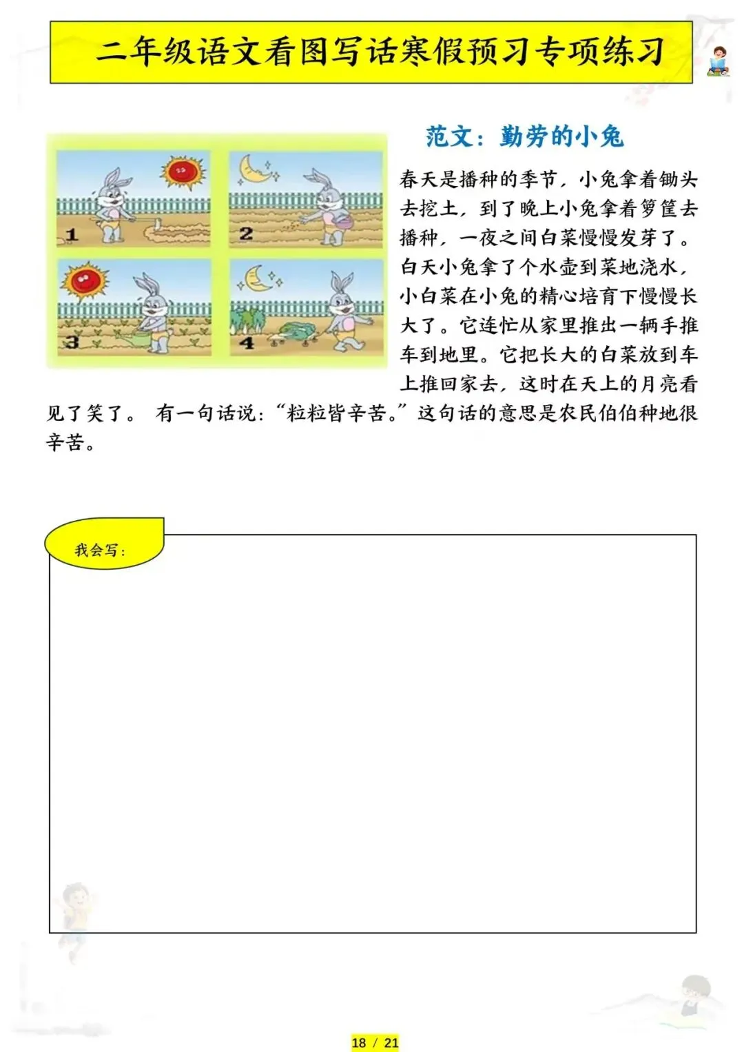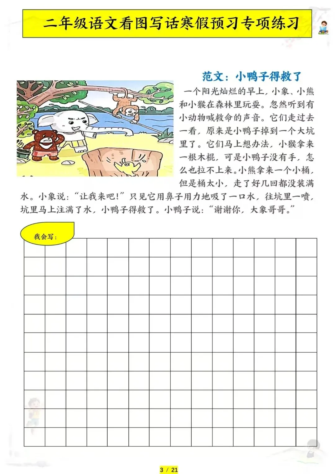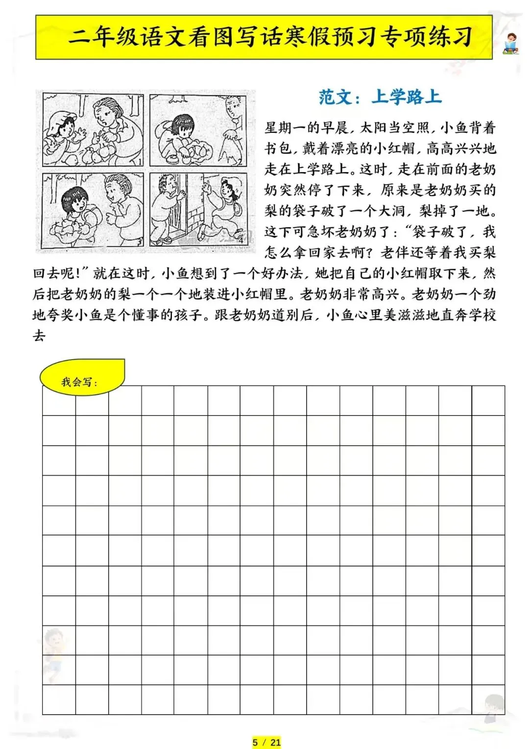 二年级语文《看图写话专项练习》,电子版可下载可打印。这份二年级语文看图写话专项练习,把课本里常考的看图写话题型都整理好了。从单幅图写几句话到多幅图写完整故事,每篇练习都标注了观察要点和写作思路,教孩子用”时间、地点、人物、事件”四要素把图片内容写具体。现在已经开学,让孩子每天练一篇,看图写话有方法、表达有思路,句子写得又生动又完整!需要的家长赶紧打印出来,给孩子备一份吧。
