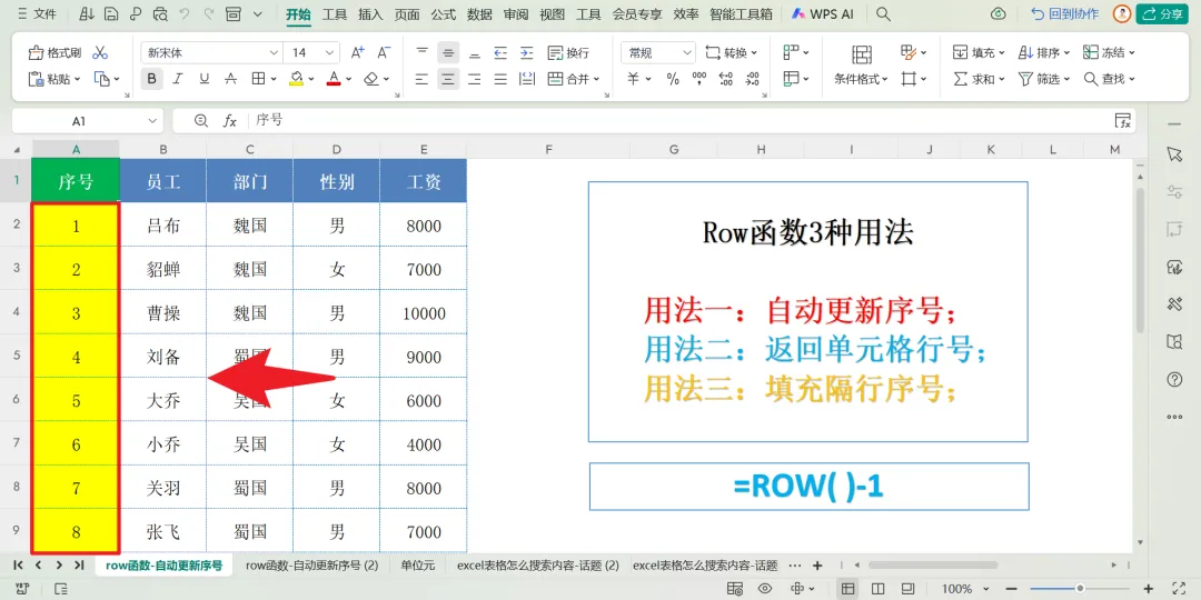 三、Row函数:序号填充的智能助手