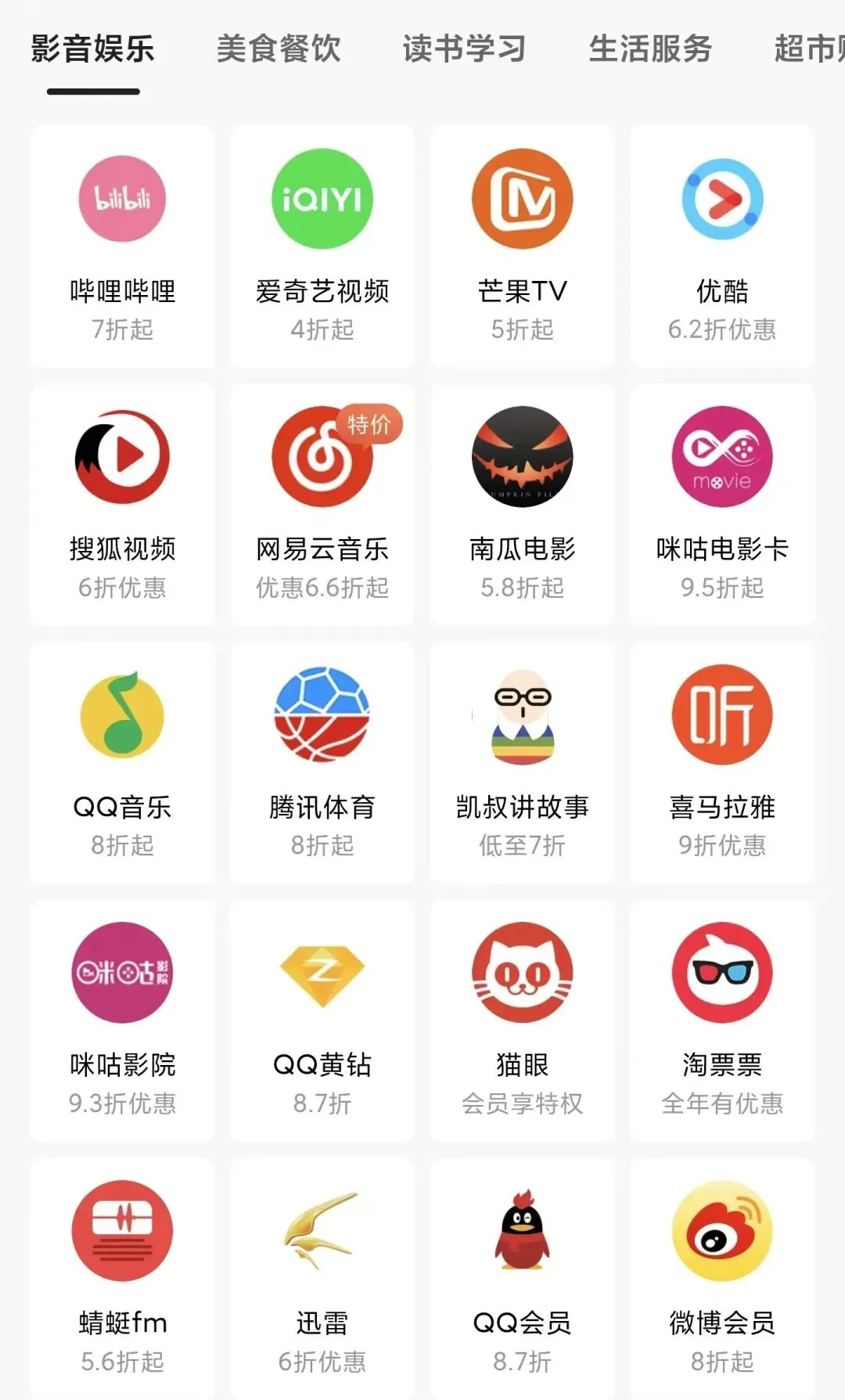 用户可以享受比官网更实惠的价格开通各大平台的会员,比如爱奇艺、腾讯视频、QQ音乐、百度网盘等主流音视频/云盘会员。