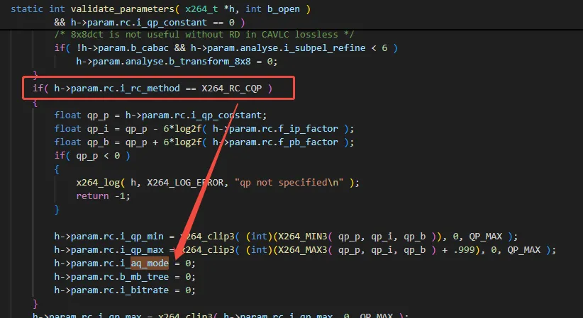为了适配CQP模式,代码会设置QP上下限,并禁用AQ、MB-Tree等与CQP冲突的功能,清空比特率配置。