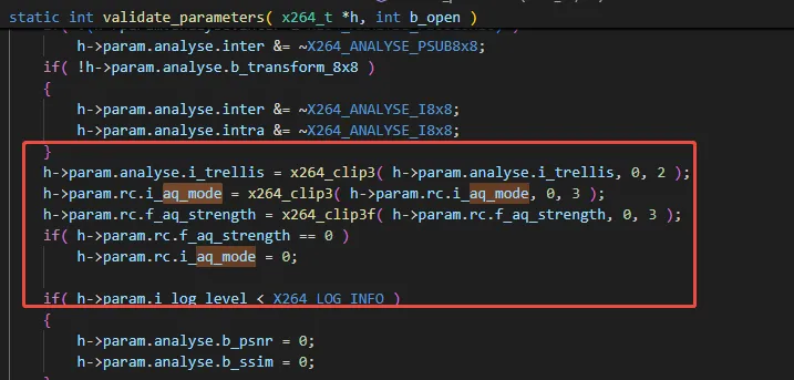 而下面这部分就是为了限制编码器关键参数的取值范围,避免非法值导致编码异常;同时保证参数逻辑一致性(比如AQ强度为0时就需要关闭AQ模式了);