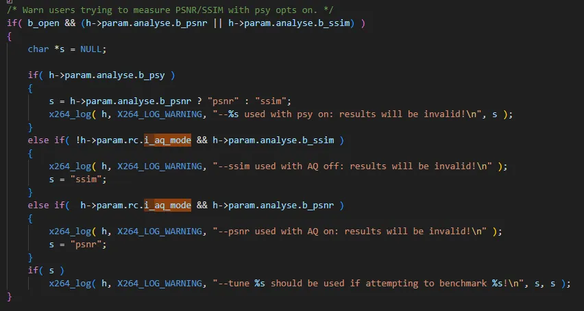 这边就是前一篇发现的彩蛋的这是:X264在“主观视觉优化”和“客观指标测试”之间做了区分,避免在优化开启时误解PSNR/SSIM的数值意义;