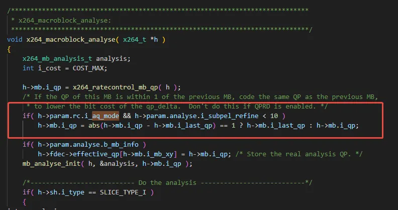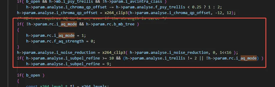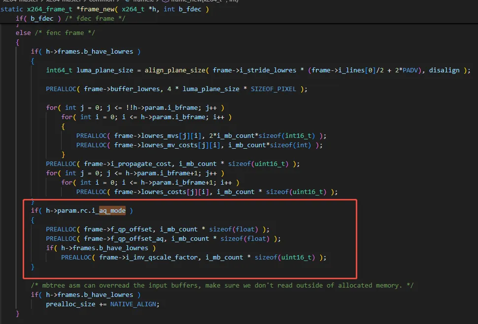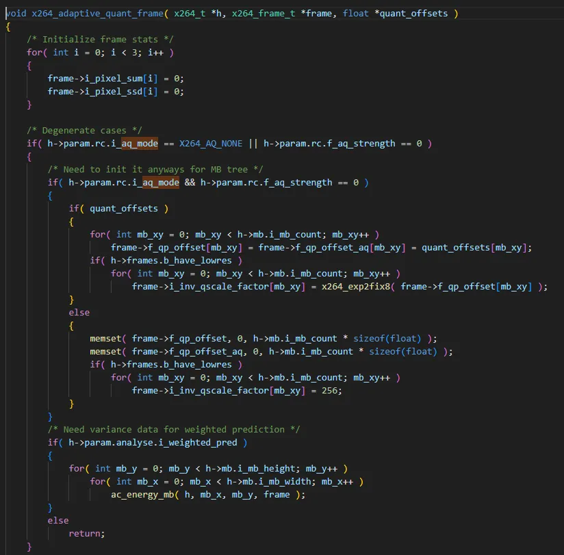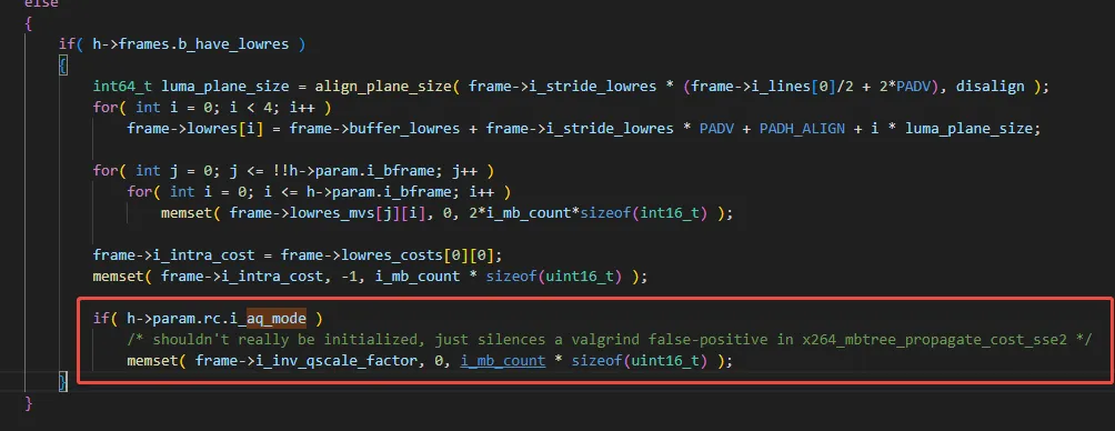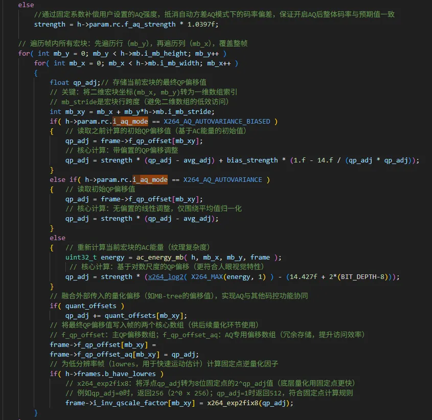 上面代码AQ功能的退化场景兜底处理逻辑——当AQ模式关闭或强度为0时,代码会保证依赖AQ相关数据的功能(如MB-tree、加权预测)仍能正常运行,避免未初始化的内存导致编码崩溃,或功能异常。