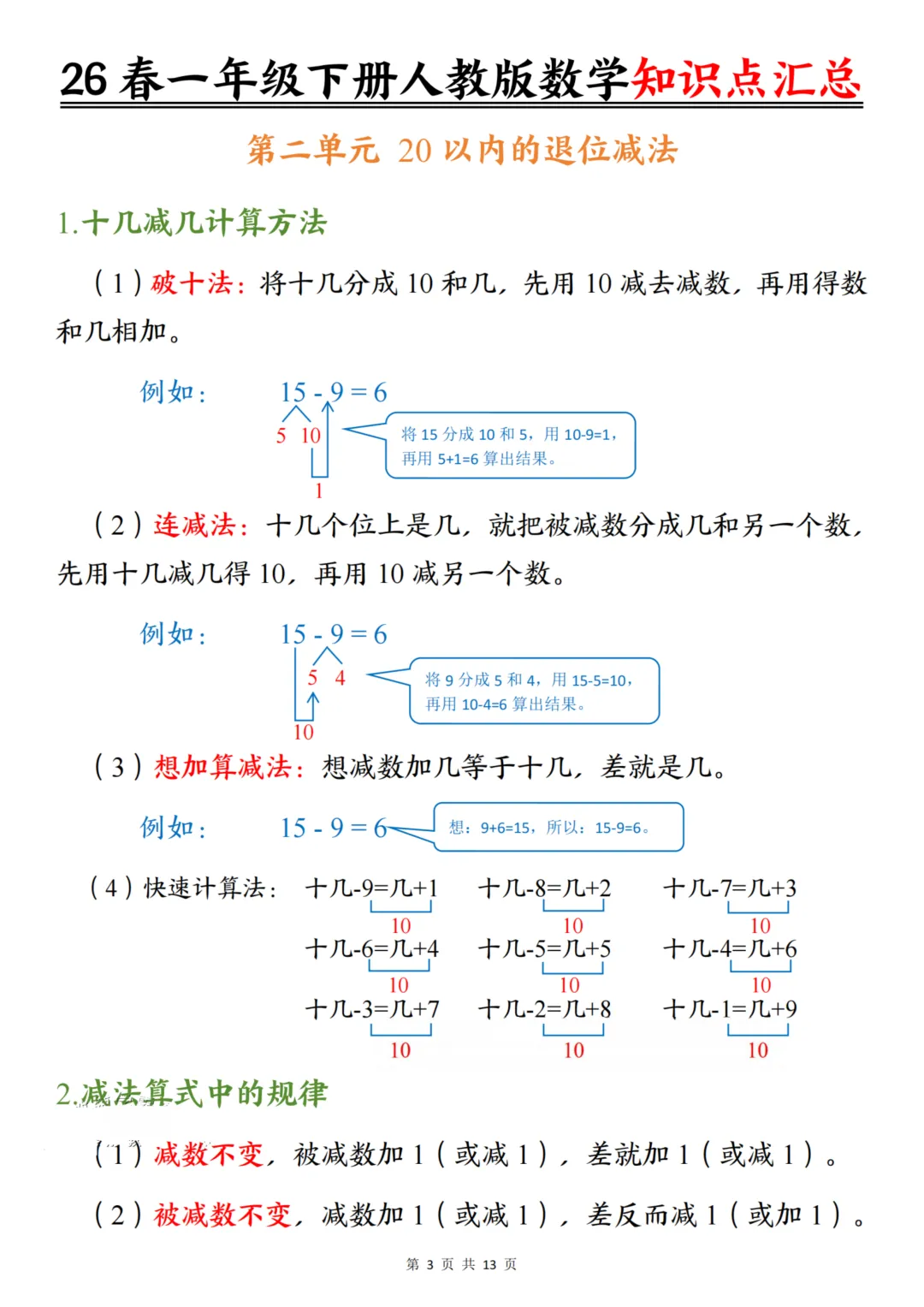 一年级下册人教版数学知识点汇总(电子版可打印)