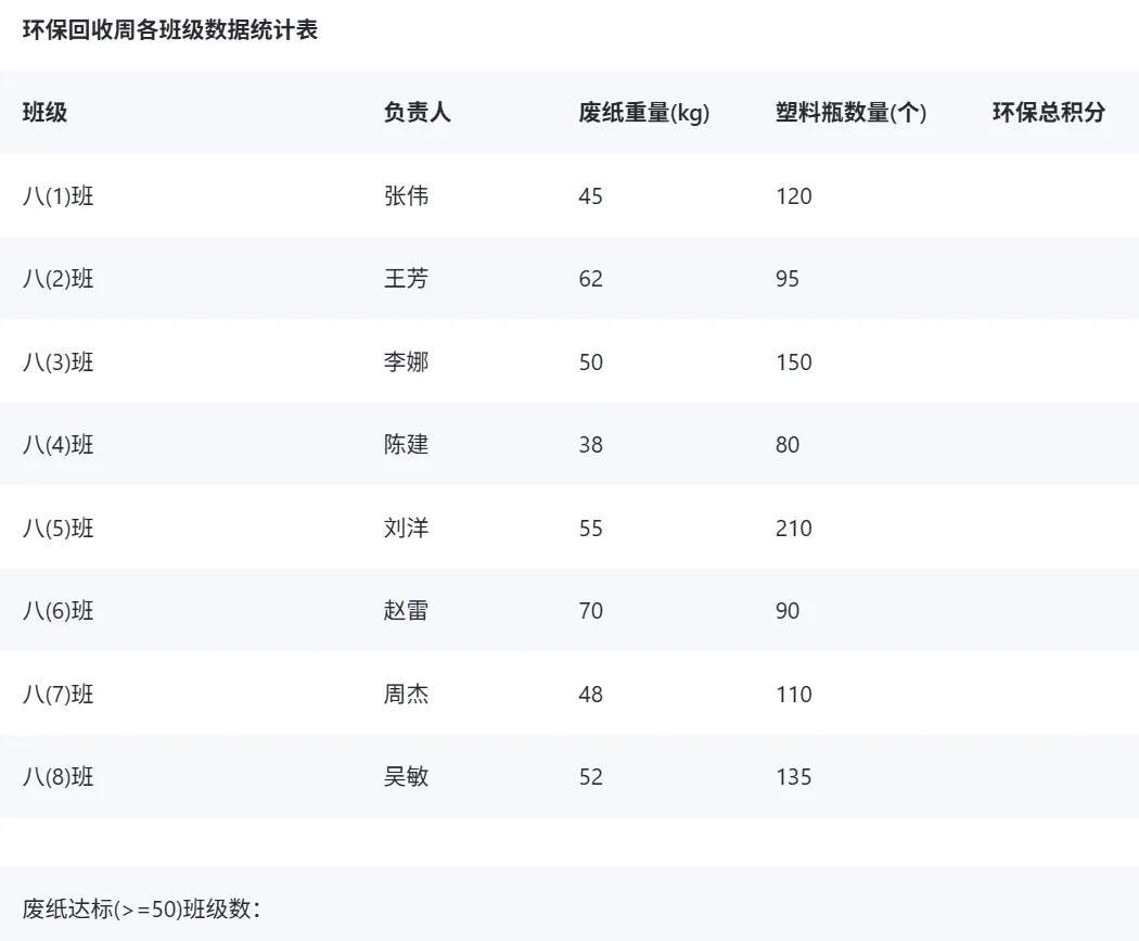 4. 在 E3:E10 单元格区域,使用公式(废纸重量*2 + 塑料瓶数量*0.5)计算各班的“环保总积分”。