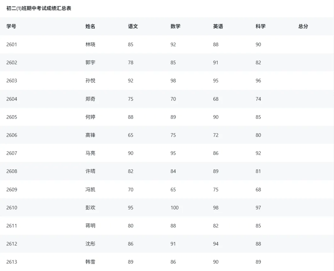 背景:初二某班进行了一次期中测试,班主任需要对成绩进行汇总并制作分析图表。