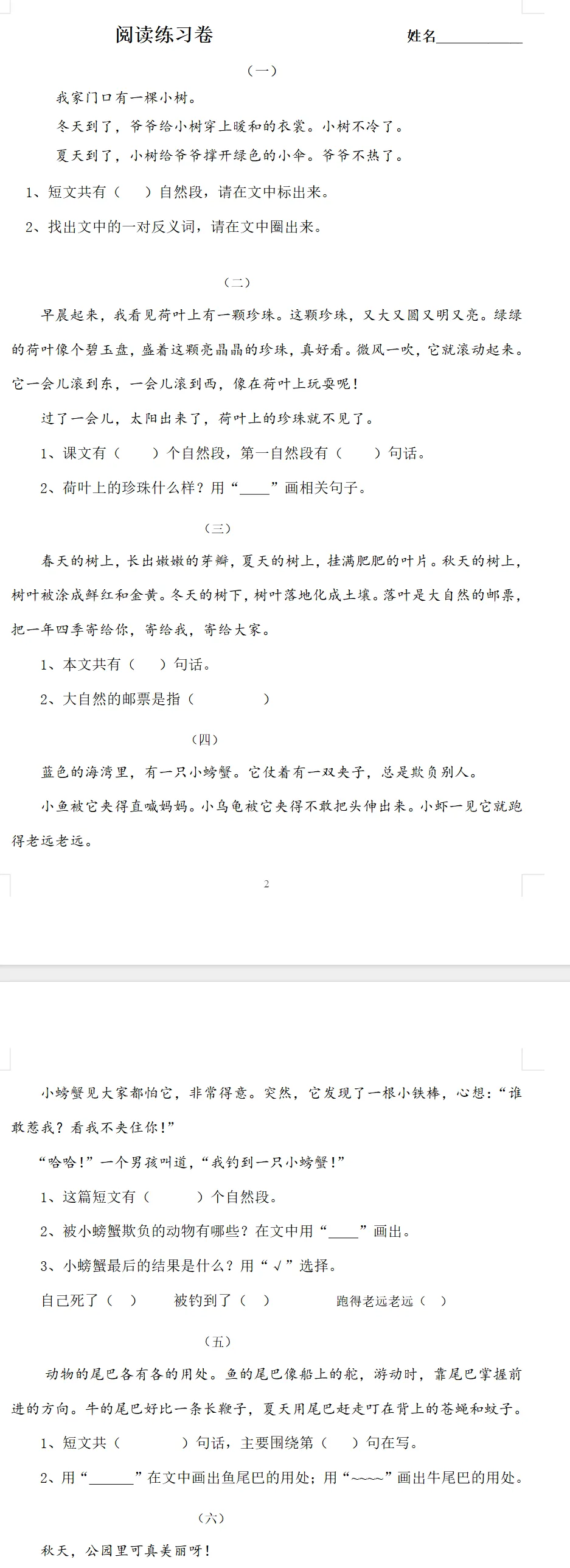 小学1-2年级阅读理解讲义及练习|高清可打印免费下载