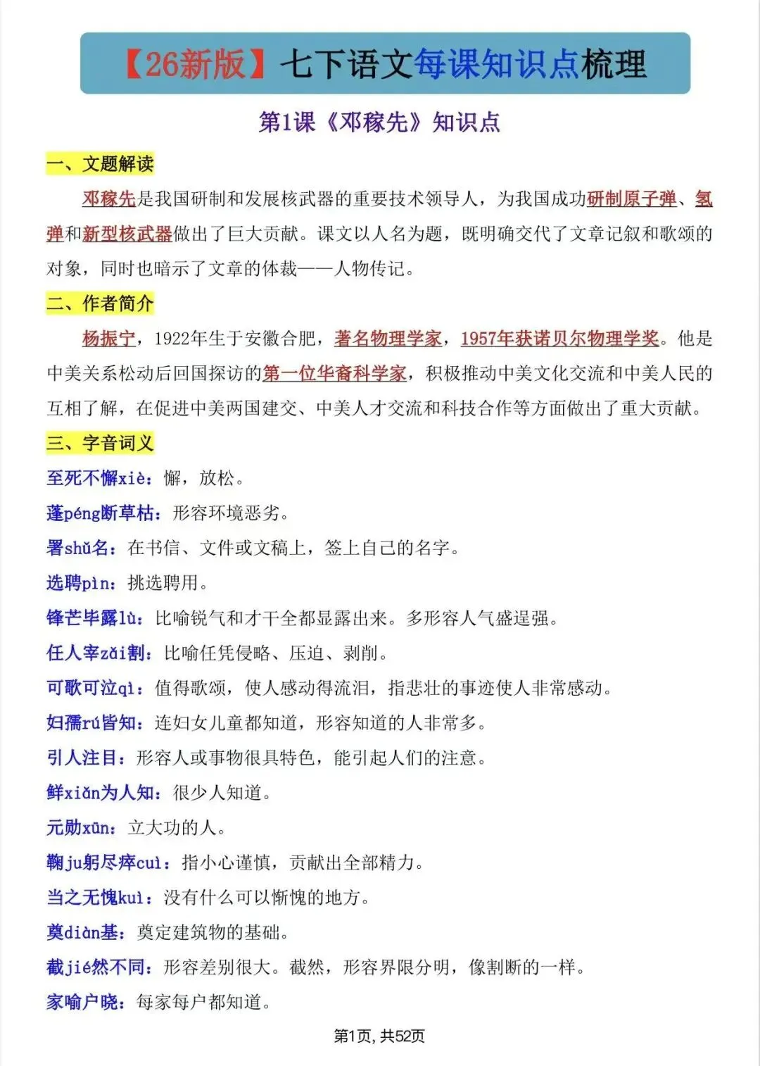 本文最后更新于2026-03-11,某些文章具有时效性,若有错误或已失效,请在下方留言或联系老夜。 七年级下语文每课知识点梳理/电子版可打印 以下为部分截图,具体看完整PDF文件 (温馨提示:文末有电子版领取方式) 领取完整电子版: ①:点一点右下角的“赞”和“在看”,感谢支持! ②:点击“关注”,回复资料领取