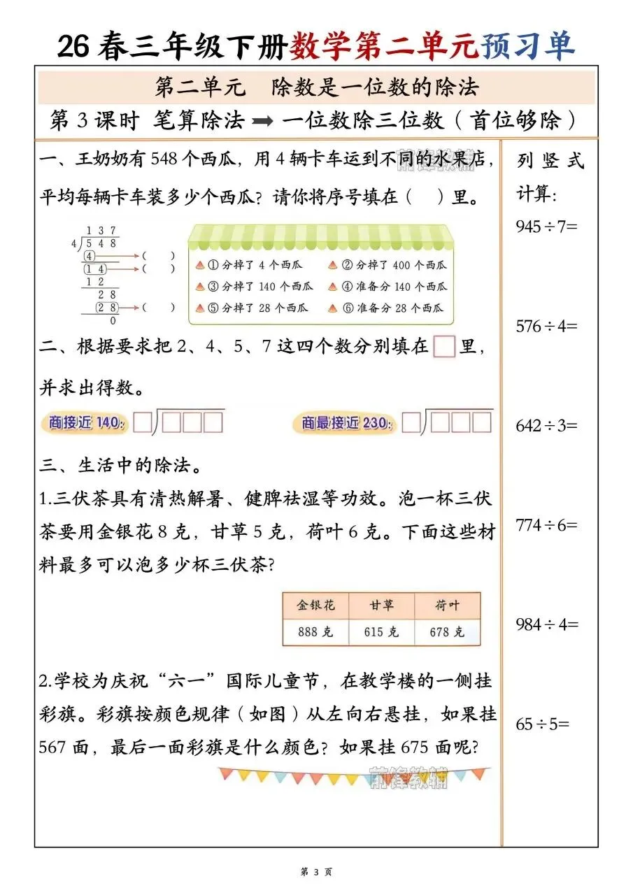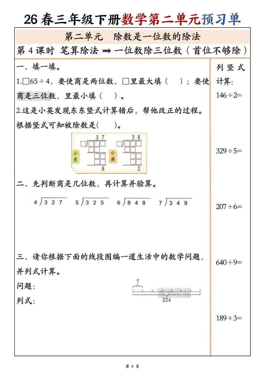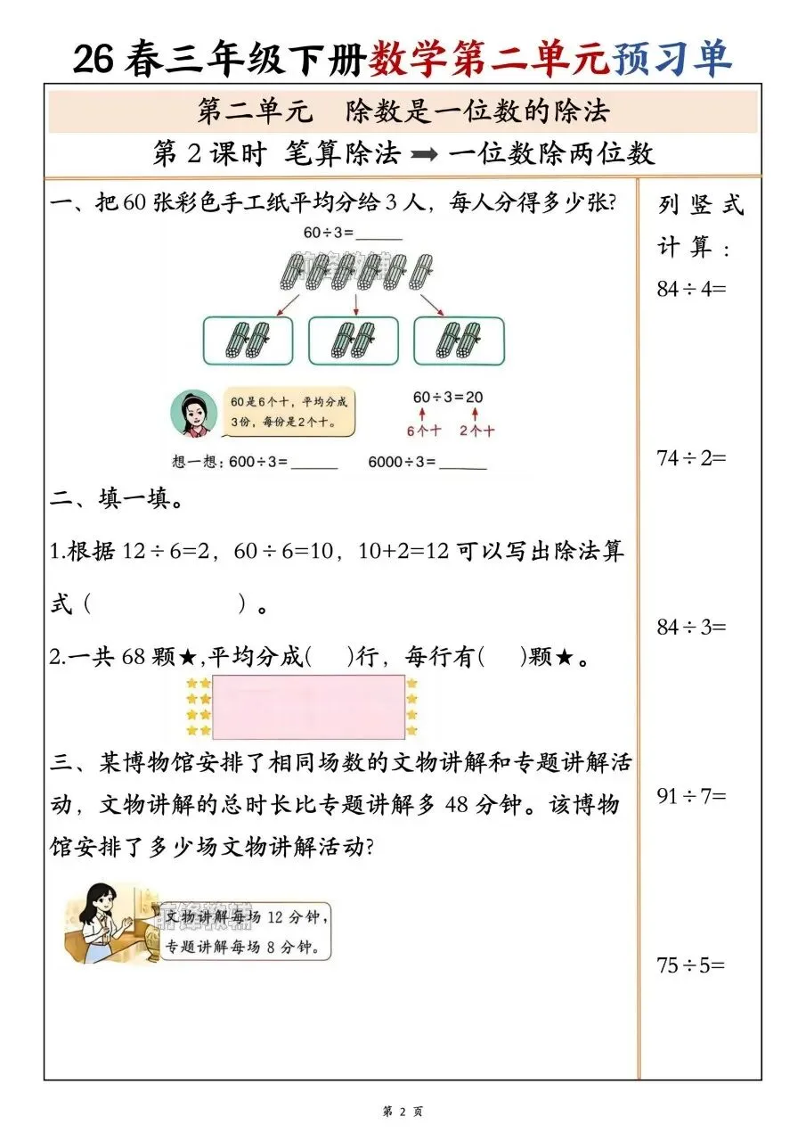26春三年级下册数学第二单元预习单电子版免费下载!