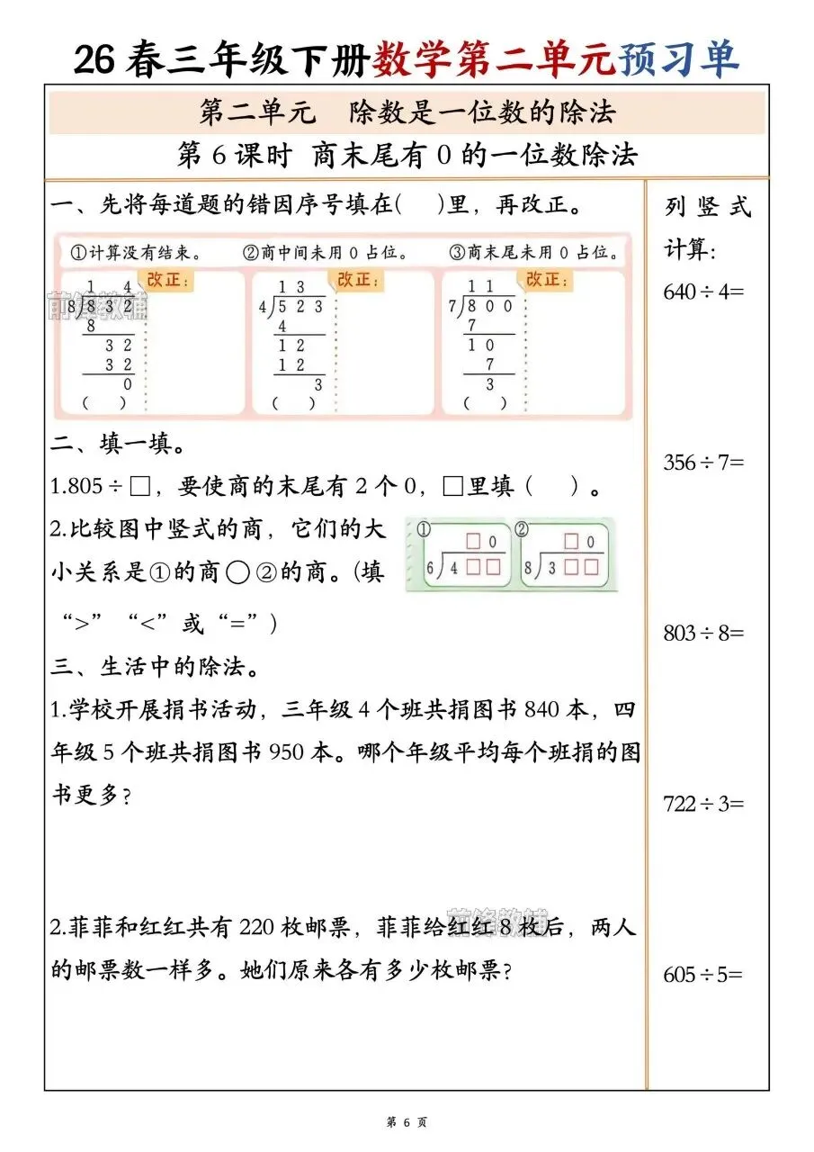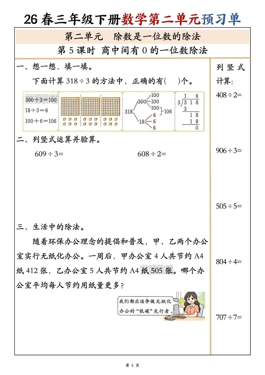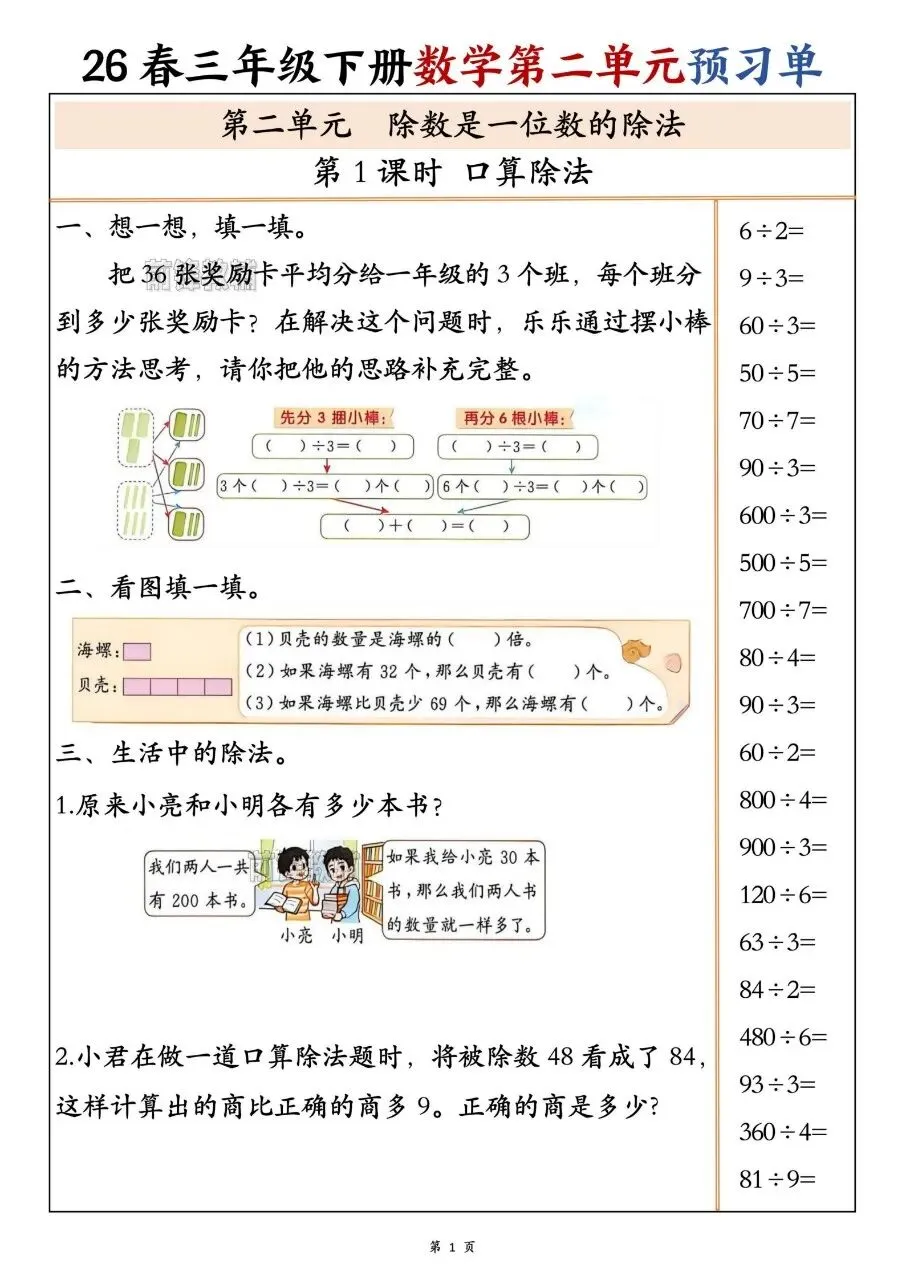 26春三年级下册数学第二单元预习单电子版免费下载!