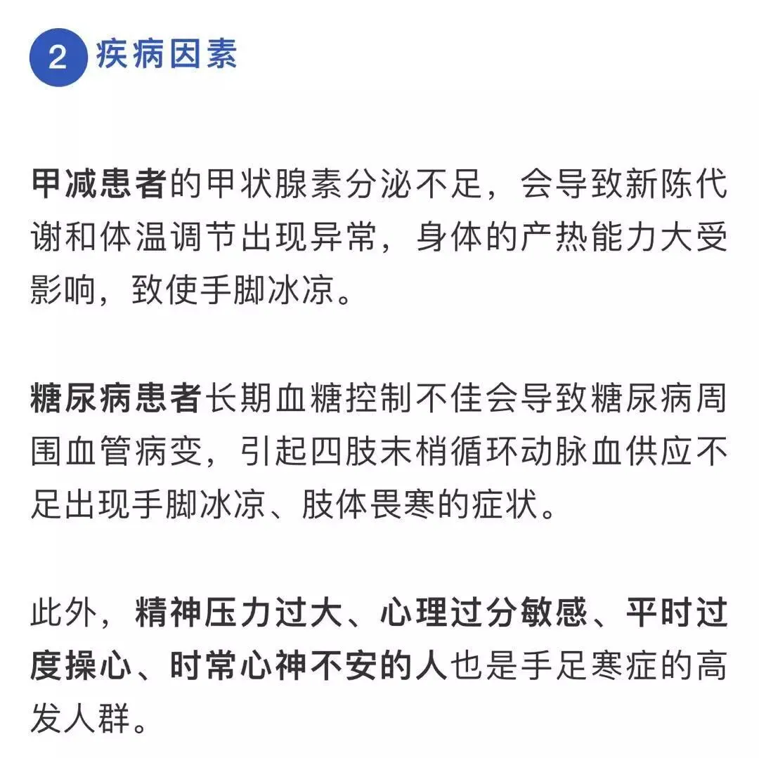 ①冬天血液的新陈代谢减缓,低气温使血管收缩,血液回流能力减弱,使得手脚,尤其是指尖、脚尖等部位的血液循环不畅,出现手足冰冷的症状。