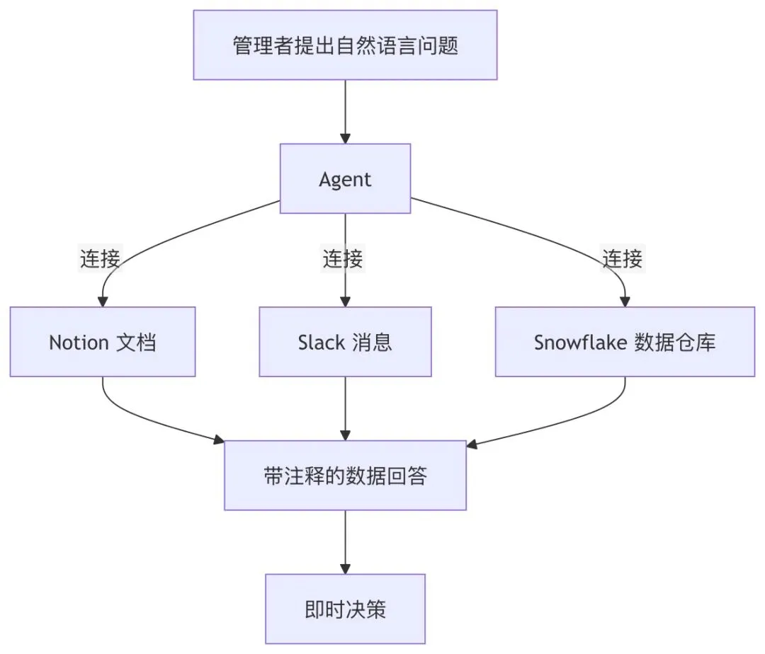 它连接了 Notion、Slack 和公司的 Snowflake 数据仓库。Ivan 用自然语言提问——某个功能的使用趋势、某个大客户的活跃度变化——Agent 直接从数据仓库里调数据,带注释地回答。