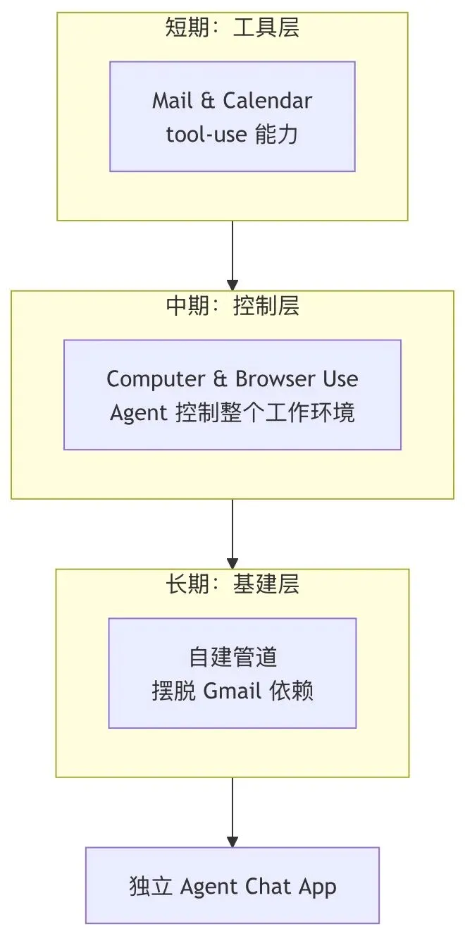 Notion 收购 Mail & Calendar 团队后的策略也在调整。短期:先把 mail 和 calendar 的 tool-use 能力做到极致,让 agent 在这些管道上如鱼得水。中期:增加 computer & browser use,让 agent 控制整个工作环境。长期:自建管道,不再依赖 Gmail 之类的基础设施。